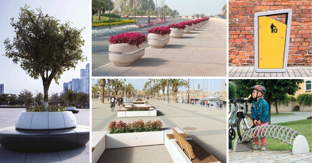 Αστικός εξοπλισμός (παγκάκια, γλάστρες, ποδηλατοστάτες, κάδοι μικρο-απορριμμάτων, σχάρες δέντρων) του ιταλικού οίκου Bellitalia με προϊόντα υψηλής αισθητικής και αντοχής στη χρήση, κατασκευασμένα από από ανασυσταμένο μάρμαρο, ή του οίκου City Design που ξεχωρίζει για τον εργονομικό σχεδιασμό και τη minimal urban αισθητική.