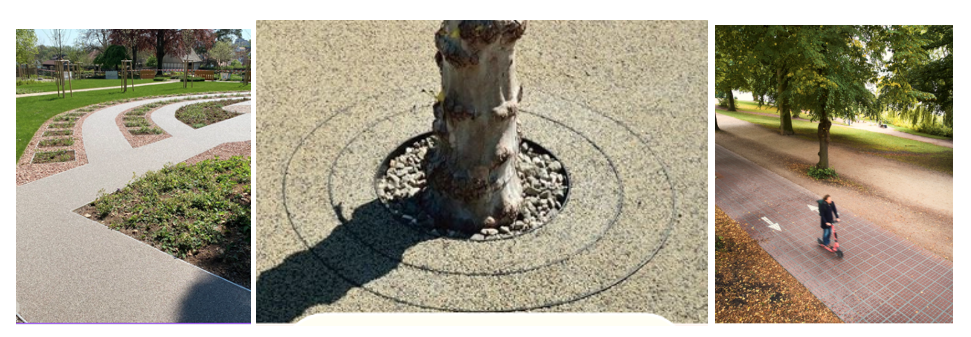 Οι υδατοπερατές επιφάνειες TTE® & Terraway® που όπως προαναφέρθηκε, λόγω των ιδιοτήτων τους, αποτελούν ιδανική λύση για την ανακατασκευή ή διαπλάτυνση πεζοδρομίων, τη δημιουργία ποδηλατοδρόμων και πράσινων διαδρομών που συνδέουν τους δημόσιους χώρους, βελτιώνοντας τη βιώσιμη κινητικότητα.