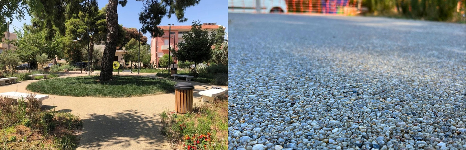 Υδατοπερατή επιφάνεια Terraway®: Σύστημα διάστρωσης κοινόχρηστων χώρων και διαδρόμων ήπιας κυκλοφορίας, που αποτελείται από μείγμα φυσικών αδρανών υλικών, όπως γρανίτης ή χαλαζίας, με ειδικές, μη-τοξικές ρητίνες ψυχρής συγκόλλησης. Πρόκειται για 100% υδατοπερατό σύστημα, που συμβάλλει στη μείωση των πλημμυρικών φαινομένων στην πόλη, και παράλληλα προστατεύει & ενισχύει τη βιοποικιλότητα του εδάφους.