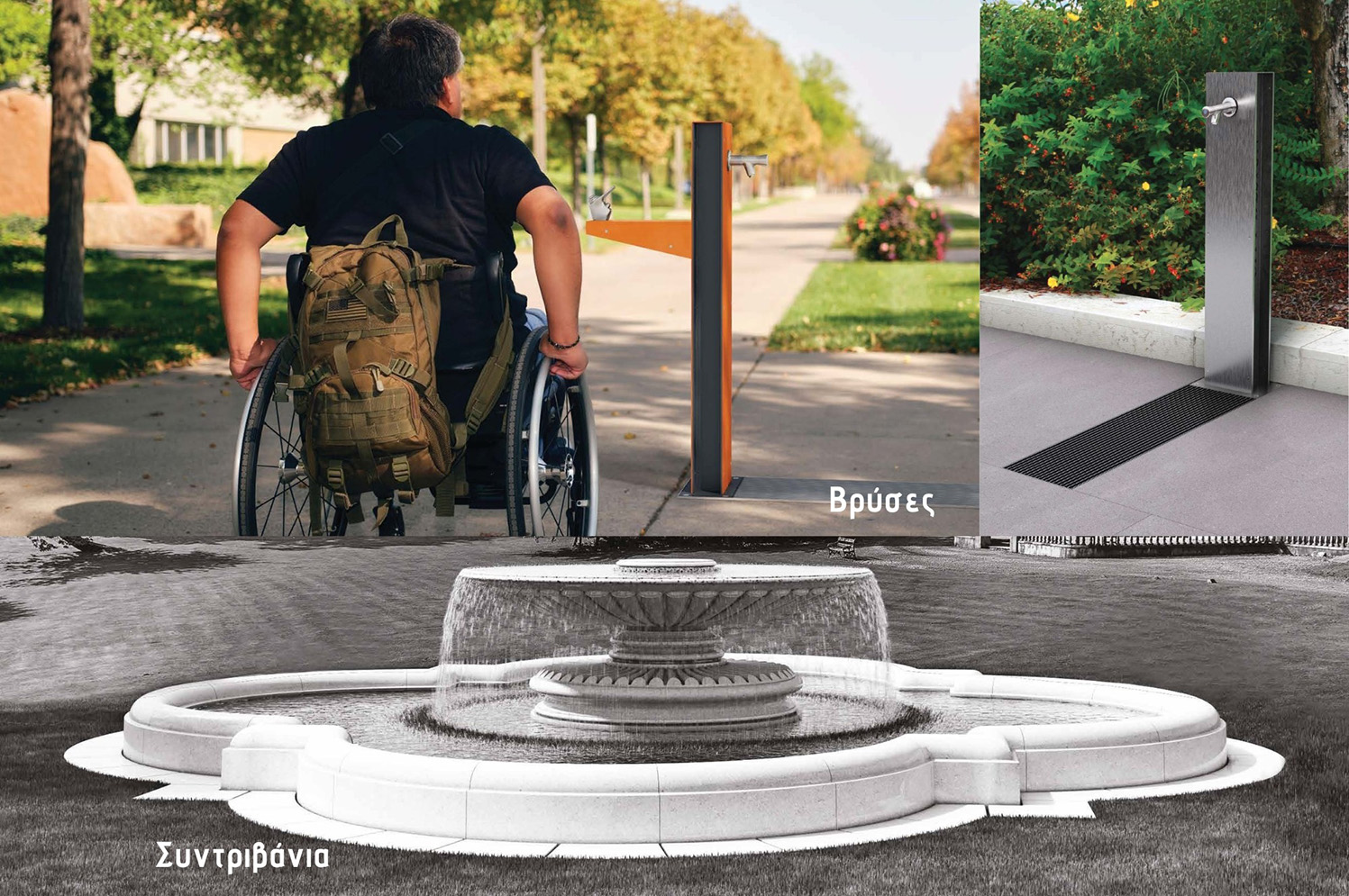 Υδάτινα στοιχεία (συντριβάνια, βρύσες):Με προϊόντα που κατασκευάζονται από φυσικά ή ανακυκλωμένα υλικά και χαρακτηρίζονται από υψηλή αισθητική, λειτουργικότητα και μακροχρόνια αντοχή.